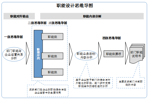 組織中的每個部門都是在賦予了一定的獨(dú)特的使命下參與到企業(yè)整體運(yùn)營中、不可缺少的組成部分,那么相應(yīng)地部門的職能從對企業(yè)整體運(yùn)營的輸出作用,到進(jìn)一步在部門內(nèi)部輸入到二級機(jī)構(gòu)或崗位,形成職能分工,整個過程都是部門職能的設(shè)計過程。